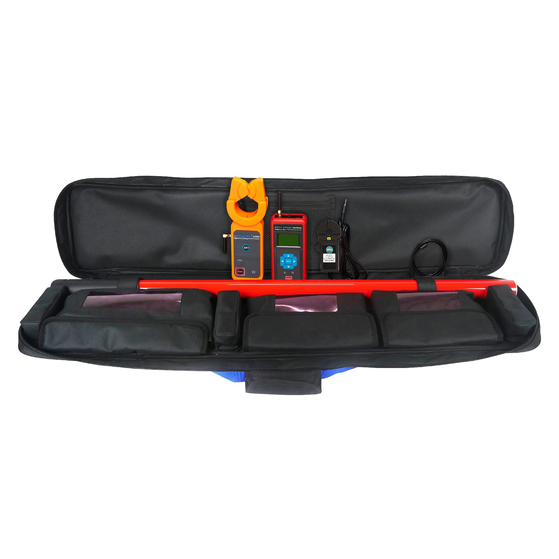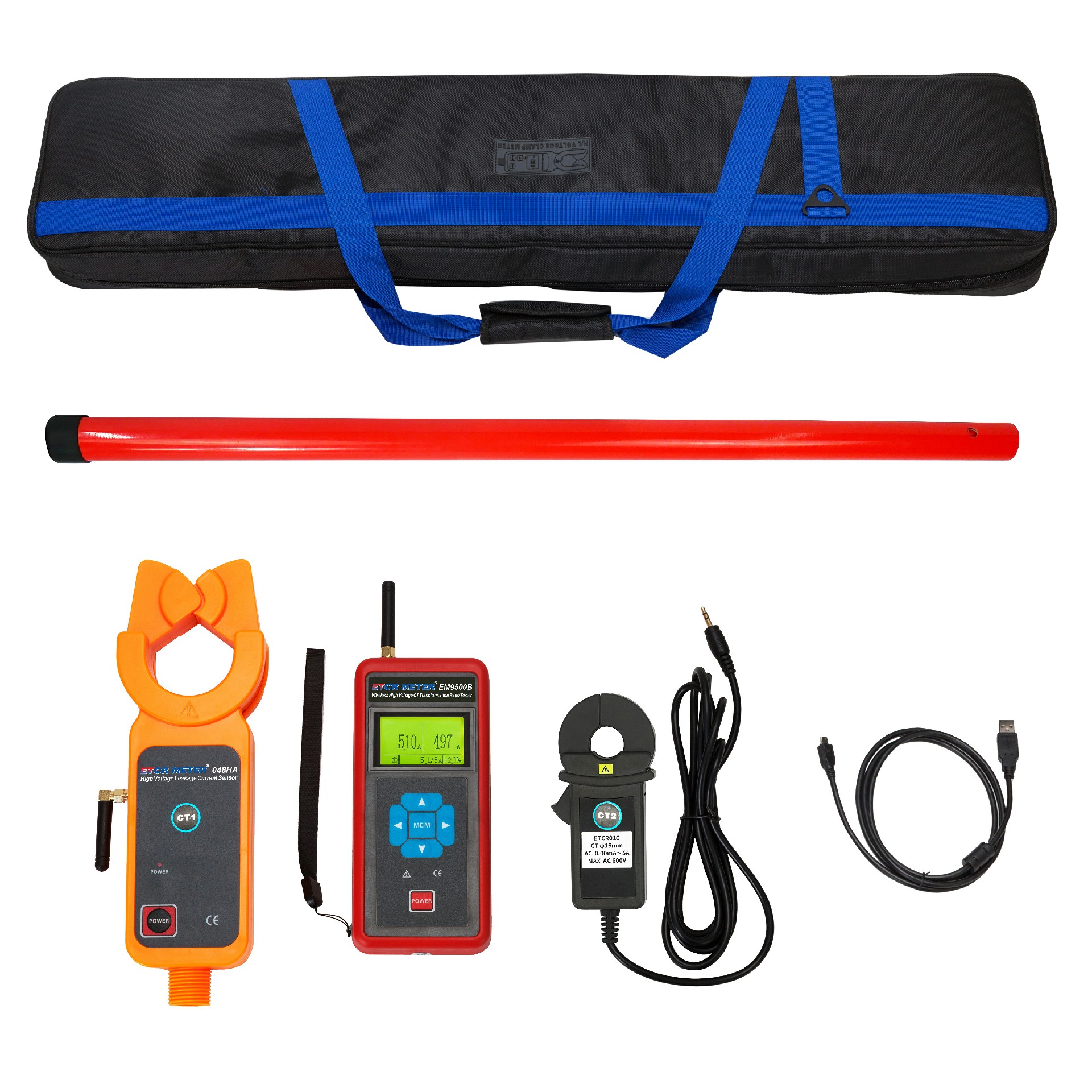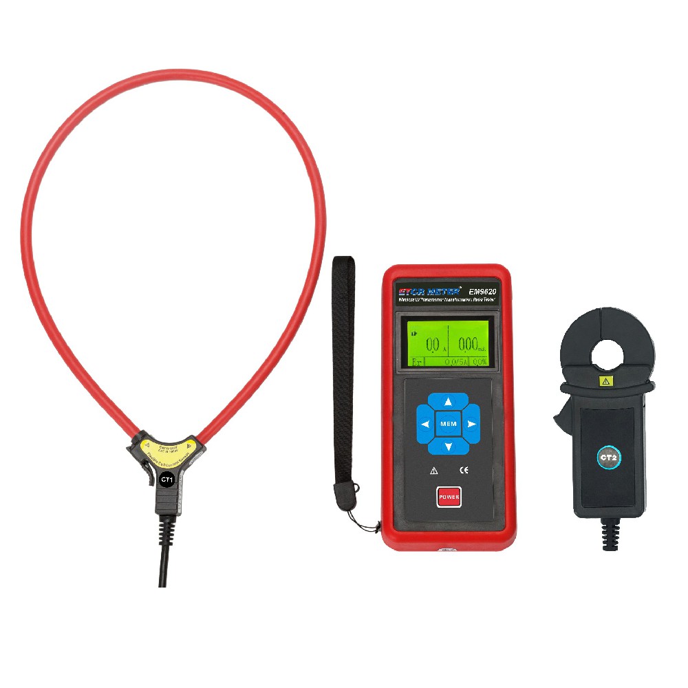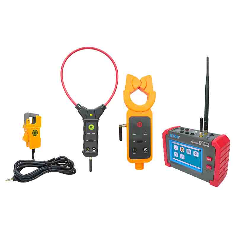 ETCR EM9500B Wireless High Voltage CT Turn Ratio Tester consists of a primary current clamp (high-voltage detector), a secondary current clamp, a host, a high-voltage insulating rod, monitoring software, and a communication line. The high-voltage current clamp is made of high-performance permalloy and has high test accuracy.The high-voltage current clamp has a unique automatic plug-in structure. It can easily clamp or evacuate the wire under test by pressing or withdrawing the insulating rod. The operation is safe, time-saving and fast. The insulating rod is lightweight and has the characteristics of moisture-proof, high temperature resistance, impact resistance, bending resistance, and high insulation. The insulation level is 110kV.The instrument has a storage function, a USB communication interface, and the stored data can be uploaded to a computer for historical data reading, viewing, saving, printing, etc.