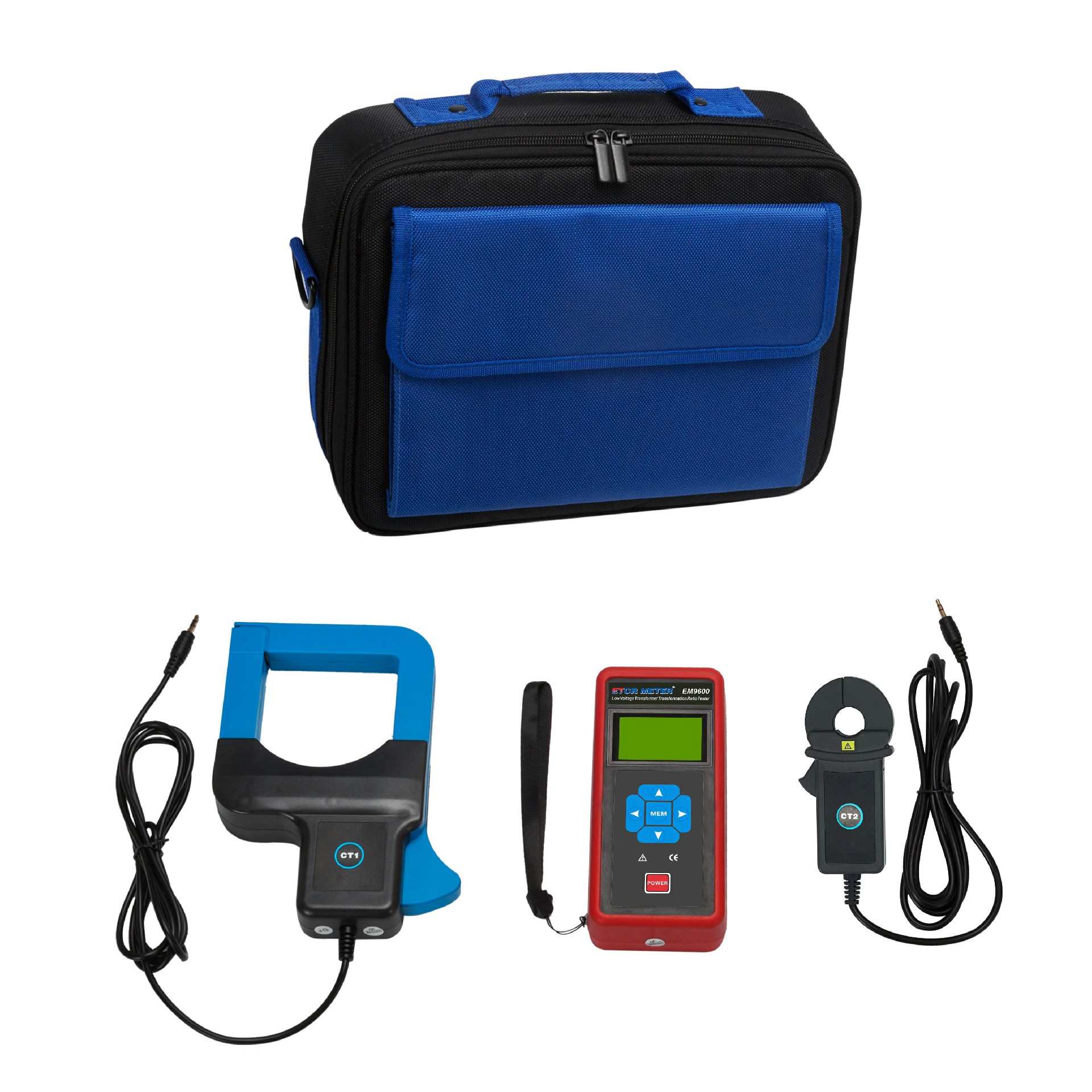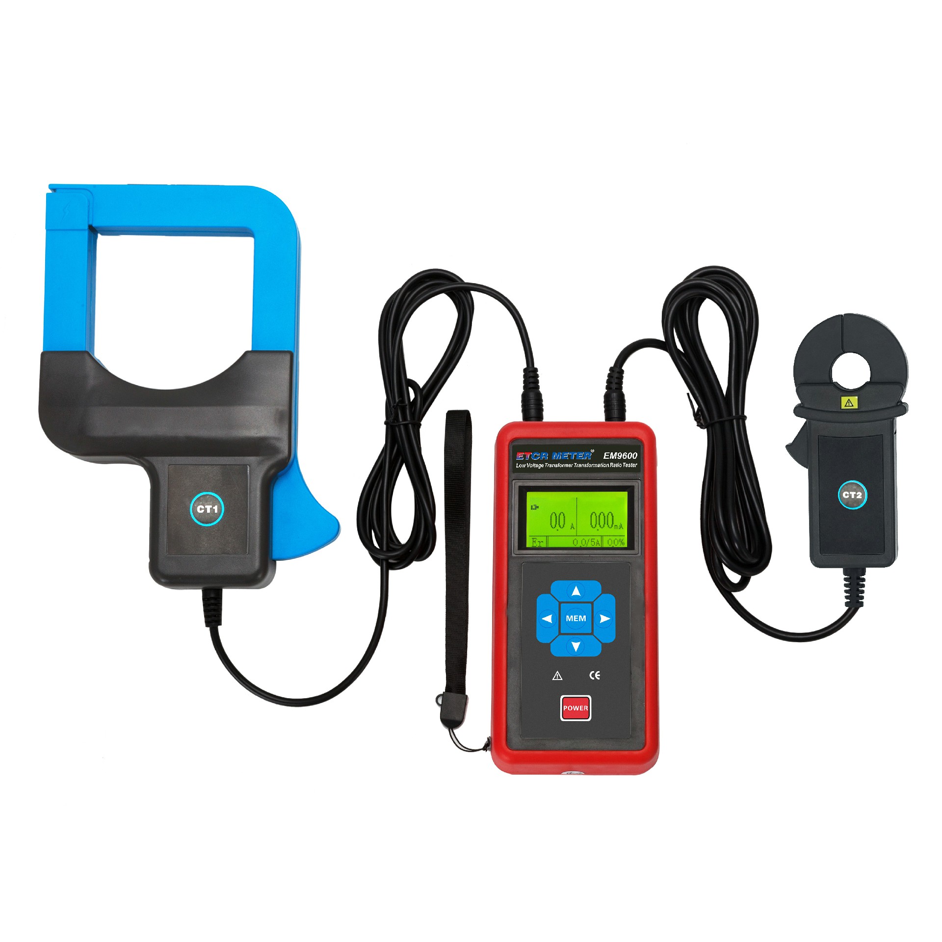 ETCR EM9600 Low Voltage CT Turn Ratio Tester, also known as transformer current variable ratio tester, transformer ratio difference tester, and current transformer variable ratio tester, is used to test the current, variable ratio, and angle difference of the first and second circuits of the medium and low-voltage current transformers in the metering device without power-off, and judge the polarity and phase difference.The tester consists of a host, a primary large-caliber current clamp, and a secondary current clamp.It provides a new type of power instrument that is safe, accurate and convenient for electricity inspectors.