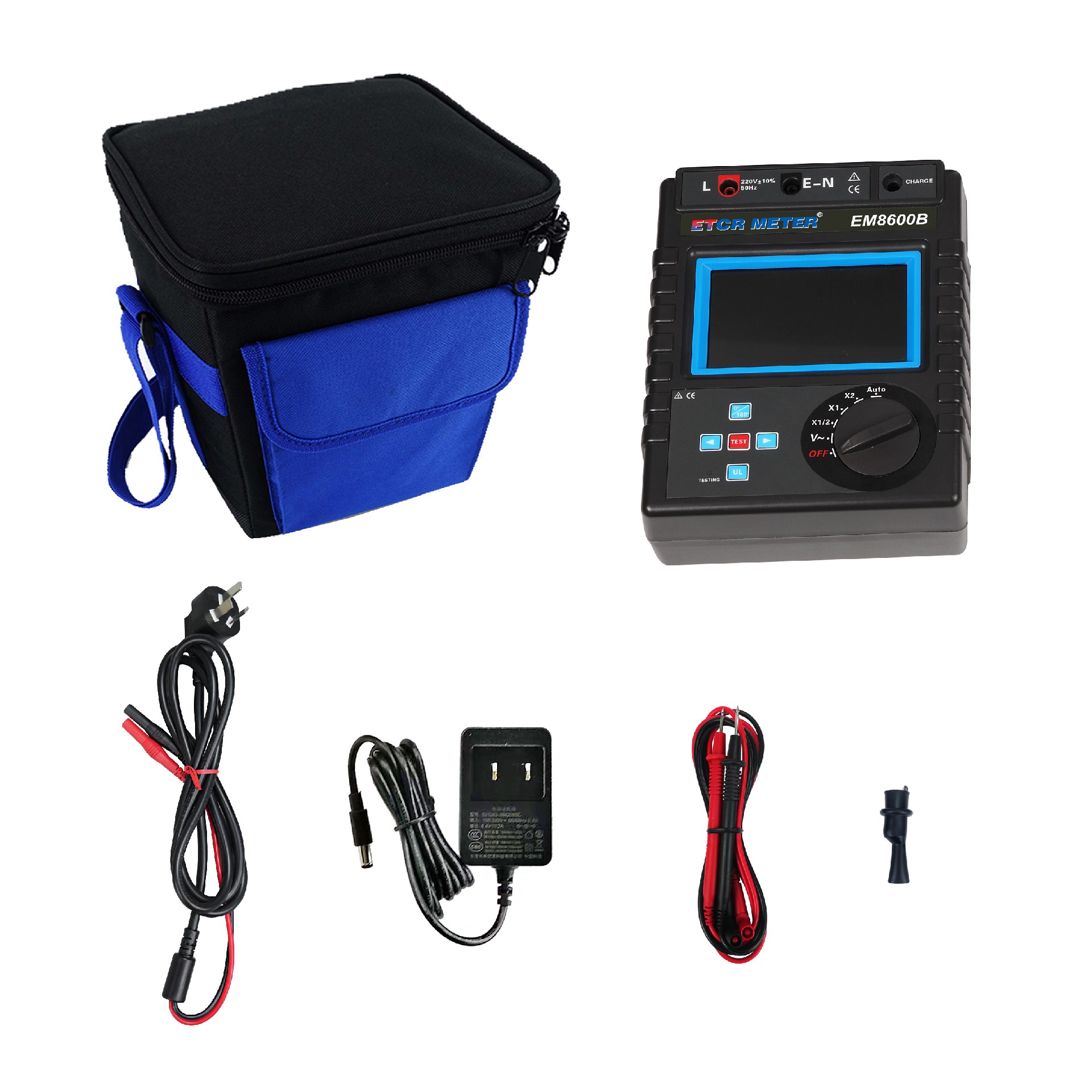 ETCR EM8600B Leakage Protector Tester adopts with large capacity lithium battery, 5 inch true-color touch screen, with functions such as battery level display, automatic shutdown, fault voltage indication setting, backlight brightness adjustment, current date and time display and memory. There is wiring diagram inside the tester, with clear instructions and easy operation. The tester has high accuracy, small size, light weight, exquisite appearance and portable, which is an ideal tool for on-site or indoor testing of various leakage protectors.