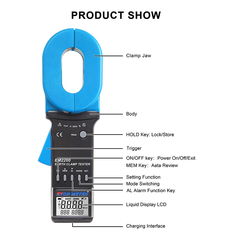 ETCR EM2200 High-End MultiFunctional Clamp Earth Resistance Tester has multiple display mode combinations, you can choose resistance + current, resistance + time, current + time to display on the same screen, larger measurement range, 999 sets of stored data, lower power consumption, using large-capacity lithium batteries, the supporting monitoring software has functions such as online real-time monitoring, historical query, software alarm setting, historical data reading, saving, reporting and other functions.