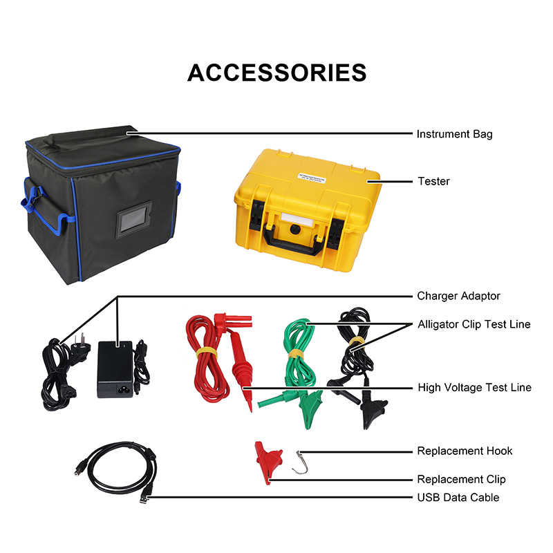 Accessories | Host tester: 1PCS; High voltage test line(red): 1PCS; Test line (green): 1PCS; Test line (black): 1PCS; Alligator clip: 1PCS; Hook: 1PCS; Power adaptor: 1PCS; USB communication cable 1PCS; Tool bag: 1PCS | |