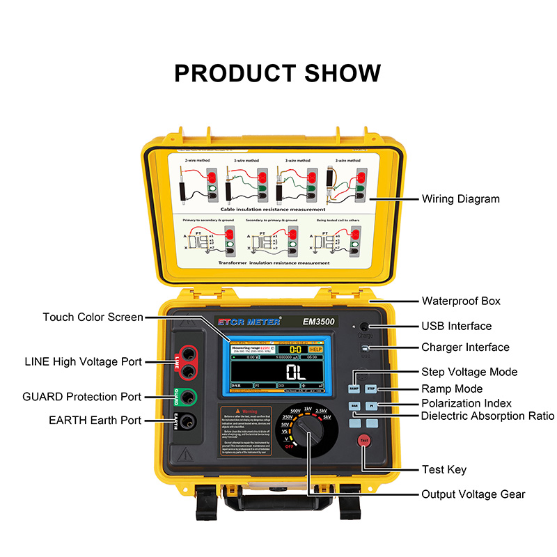ETCR EM3500 High Voltage Insulation Resistance Tester, also known as high voltage megohm meter and high voltage insulation resistance meter, The tester has complete various insulation resistance index test functions, self-set test voltage function, and good anti-interference ability. It has obvious advantage in substation and other environments with strong induction and large distributed capacitance. The instrument equip with true-color touch screen, and all test data and battery power are displayed on the same screen which is clear and obvious, the combination of the rotary switch and the button makes the operation very simple. The user does not need to memorize the operation method, and the operation method will pop up by clicking the "HELP" button on the screen, effectively guiding the user to operate the instrument. The tester is suitable for insulation resistance testing of large-scale equipment such as electrical equipment and transmission lines in large-capacity, high-voltage, and strong-inductive environments. It is a commonly used and indispensable instrument in the departments of electric power, telecommunications, meteorology, computer rooms, oil fields, electromechanical installation and maintenance, and power supply departments of industrial and mining enterprises. The test timer of the instrument automatically records the test time and stores the test results with date and time.The touch screen can easily check the recorded historical data. The completely isolated USB interface and Bluetooth communication can safely upload the test data to the PC or mobile phone for users to analyze data. The instrument provide with the test lines of double-layer insulation and shielding layer, and the high-voltage rod is equipped with replaceable alligator clips and hooks, which can be adapted to various test sites, The instrument adopt with solid double-layer shell structure. and the protection level of the case is lP65, which can prevent the intrusion of moisture and dust during transportation and storage, and prevent impact and effectively protect the instrument.