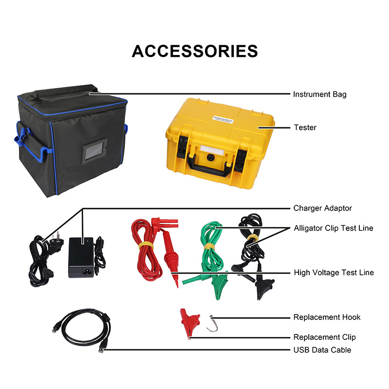 Accessories | Host tester: 1PCS; High voltage test line(red): 1PCS; Test line (green): 1PCS; Test line (black): 1PCS; Alligator clip: 1PCS; Hook: 1PCS; Power adaptor: 1PCS; USB communication cable 1PCS; Tool bag: 1PCS | ||