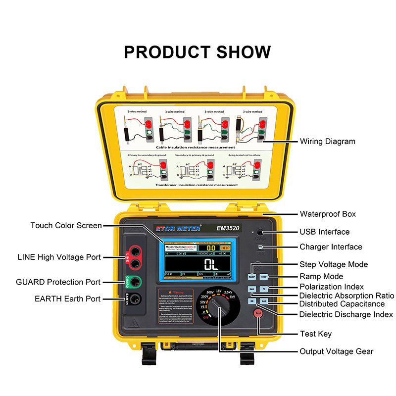 ETCR EM3520 High Voltage Insulation Resistance Tester, also known as high voltage megohm meter and high voltage insulation resistance meter, The tester has complete various insulation resistance index test functions, self-set test voltage function, and good anti-interference ability. It has obvious advantage in substation and other environments with strong induction and large distributed capacitance. The instrument equip with true-color touch screen, and all test data and battery power are displayed on the same screen which is clear and obvious, the combination of the rotary switch and the button makes the operation very simple. The user does not need to memorize the operation method, and the operation method will pop up by clicking the "HELP" button on the screen, effectively guiding the user to operate the instrument. The tester is suitable for insulation resistance testing of large-scale equipment such as electrical equipment and transmission lines in large-capacity, high-voltage, and strong-inductive environments. It is a commonly used and indispensable instrument in the departments of electric power, telecommunications, meteorology, computer rooms, oil fields, electromechanical installation and maintenance, and power supply departments of industrial and mining enterprises. The test timer of the instrument automatically records the test time and stores the test results with date and time.The touch screen can easily check the recorded historical data. The completely isolated USB interface and Bluetooth communication can safely upload the test data to the PC or mobile phone for users to analyze data. The instrument provide with the test lines of double-layer insulation and shielding layer, and the high-voltage rod is equipped with replaceable alligator clips and hooks, which can be adapted to various test sites, The instrument adopt with solid double-layer shell structure. and the protection level of the case is lP65, which can prevent the intrusion of moisture and dust during transportation and storage, and prevent impact and effectively protect the instrument.