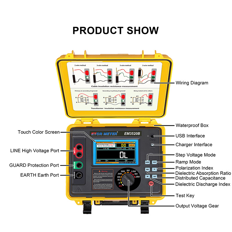 ETCR EM3520B High Voltage Insulation Resistance Tester, also known as high voltage megohm meter and high voltage insulation resistance meter, The tester has complete various insulation resistance index test functions, self-set test voltage function, and good anti-interference ability. It has obvious advantage in substation and other environments with strong induction and large distributed capacitance. The instrument equip with true-color touch screen, and all test data and battery power are displayed on the same screen which is clear and obvious, the combination of the rotary switch and the button makes the operation very simple. The user does not need to memorize the operation method, and the operation method will pop up by clicking the "HELP" button on the screen, effectively guiding the user to operate the instrument. The tester is suitable for insulation resistance testing of large-scale equipment such as electrical equipment and transmission lines in large-capacity, high-voltage, and strong-inductive environments. It is a commonly used and indispensable instrument in the departments of electric power, telecommunications, meteorology, computer rooms, oil fields, electromechanical installation and maintenance, and power supply departments of industrial and mining enterprises. The test timer of the instrument automatically records the test time and stores the test results with date and time.The touch screen can easily check the recorded historical data. The completely isolated USB interface and Bluetooth communication can safely upload the test data to the PC or mobile phone for users to analyze data. The instrument provide with the test lines of double-layer insulation and shielding layer, and the high-voltage rod is equipped with replaceable alligator clips and hooks, which can be adapted to various test sites, The instrument adopt with solid double-layer shell structure. and the protection level of the case is lP65, which can prevent the intrusion of moisture and dust during transportation and storage, and prevent impact and effectively protect the instrument.