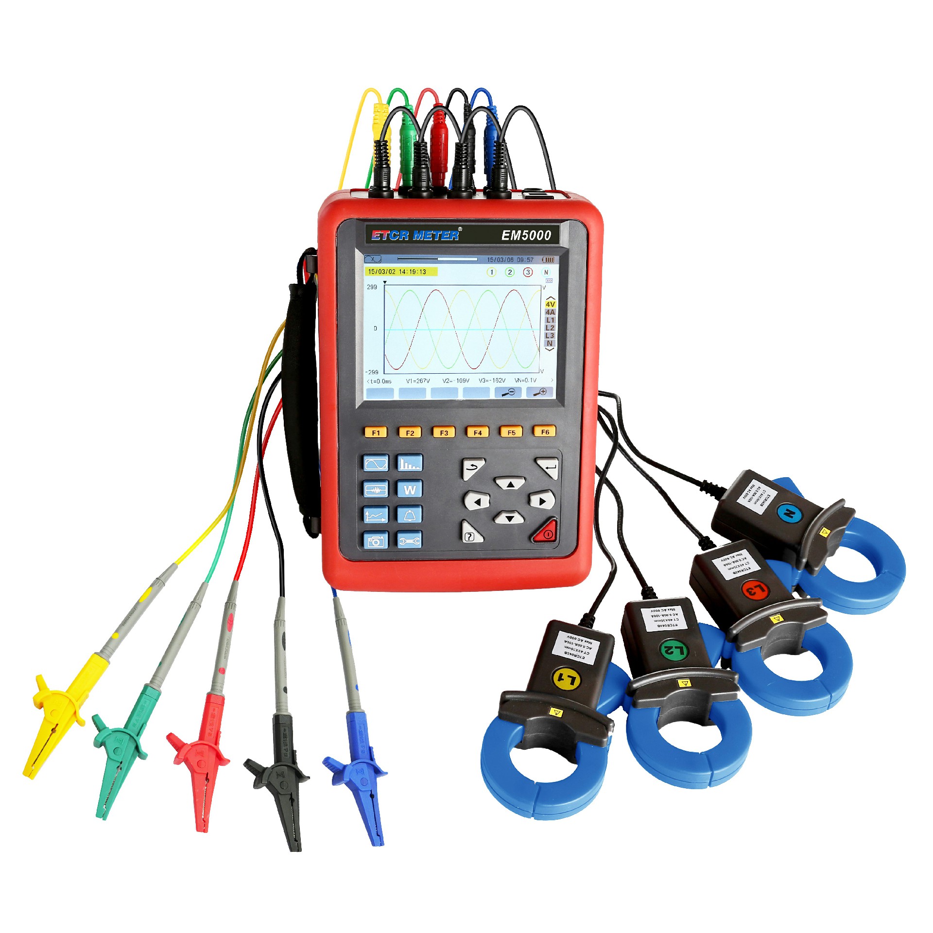 ETCR EM5000 Power Quality Analyzer, also known as power parameter tester and harmonic analyzer, which is a multifunctional and intelligent integrated test instrument designed for on field testing of three-phase power parameter. Can simultaneously measure 4 channel currents (ABC three-phase and neutral line current), 4 channel voltages (ABC three-phase voltage and neutral line grounding voltage), peak value of current and voltage, maximum and minimum value over a period of time, three-phase imbalance, short-term voltage flicker, transformer K-factor, active power, reactive power, apparent power, power factor, displacement power factor, active energy, reactive energy, apparent energy, harmonic ratio, total harmonic distortion, etc; Display real-time waveform of current and voltage, phasor diagram and harmonic ratio bar chart; Dynamic capture instantaneous changes of voltage and current, monitoring starting current, monitoring various power parameters and generating alarm lists, long-term recording of test data and generation of trend graphs and other functions. Suitable for power, petrochemical, metallurgical, railway, industrial and mining enterprises, scientific research institutions, metrology departments, etc.
