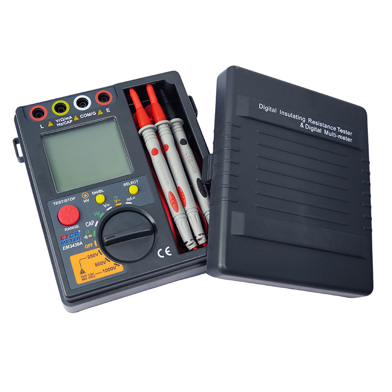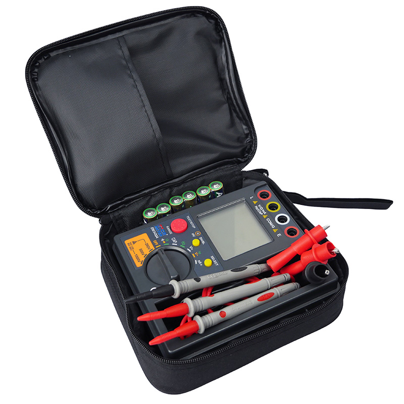 This product is an insulation resistance multimeter. It is fully functional, highly accurate, reliable and easy to use. Insulation test voltage can be switched. Ordinary insulation resistance meter can not measure its own output high voltage, in the insulation resistance meter output high voltage does not meet the rated value, the user is not easy to find, so that sometimes the measurement results deviation is too large, resulting in safety hazards, can be timely monitoring of the output high voltage, the user at any time can observe the actual output of the instrument measurement voltage, to effectively avoid misjudgment due to the output voltage is not in line with the requirements of the rated value. The measurement range of the meter can reach up to 40GΩ, and the measurement time can be set according to the need, and the measurement result will be kept automatically after the measurement is finished. Digital multimeter functions are AC and DC voltage, current, resistance, capacitance, frequency, diode and on-off measurements, etc. The digital multimeter function and insulation resistance meter function are completely separate, in the use of the multimeter function, do not have to worry about high voltage generated by the insulation resistance meter electric shock. This product is suitable for measuring the insulation resistance of transformers, motors, cables, switches, electrical appliances and other kinds of electrical equipment and insulating materials, maintenance and repair of all kinds of electrical equipment, testing and calibration. It has a compact structure, easy to carry, is your ideal electrician, electronic test instrument.